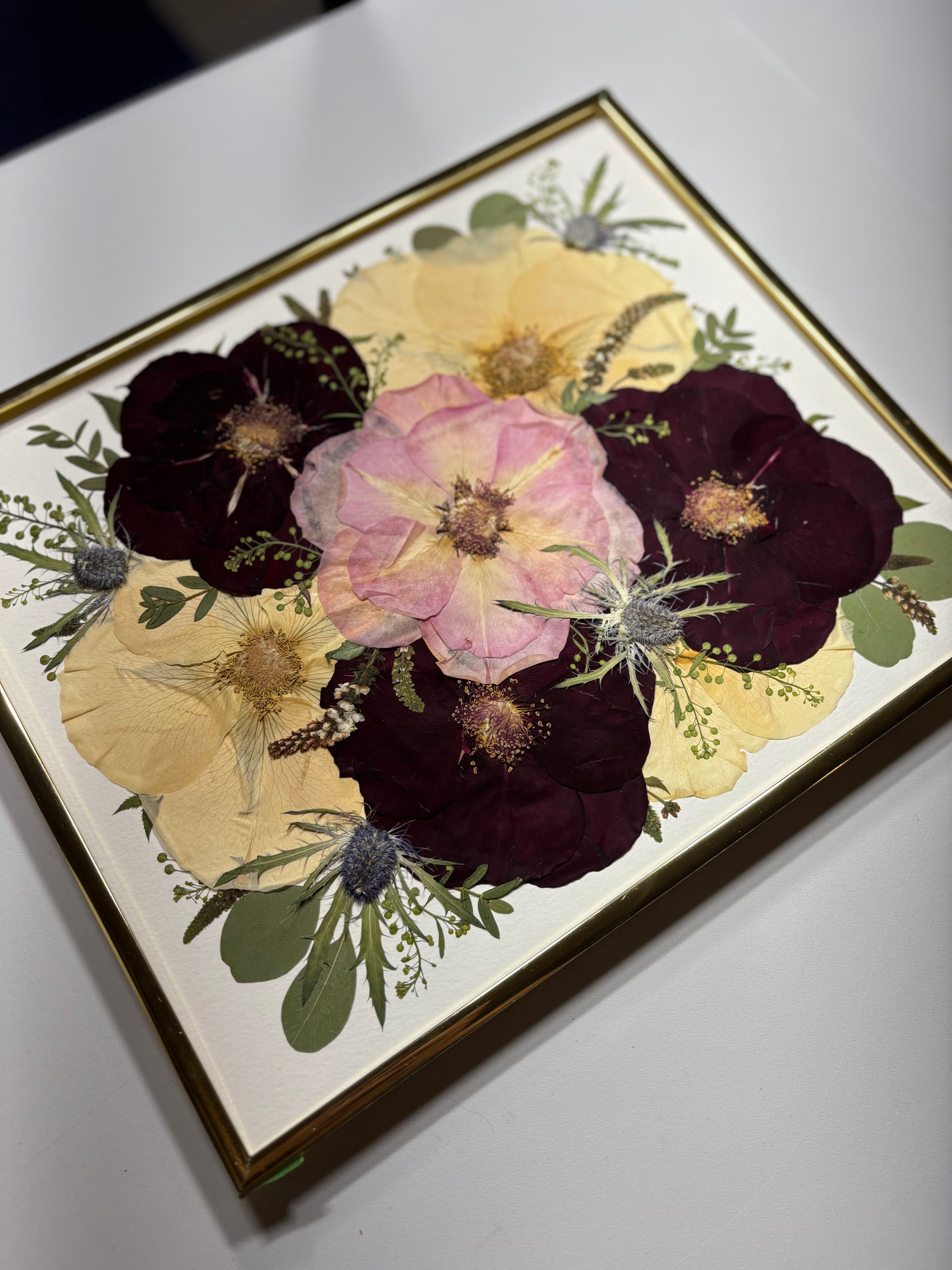 C'est essentiel pour nous de créer en utilisant ce qui existe déjà, en générant le moins de déchets possible. C'est pourquoi on récupère des cadres pré-aimés et qu'on donne une seconde vie aux fleurs, pour les transformer en compositions uniques et durables.