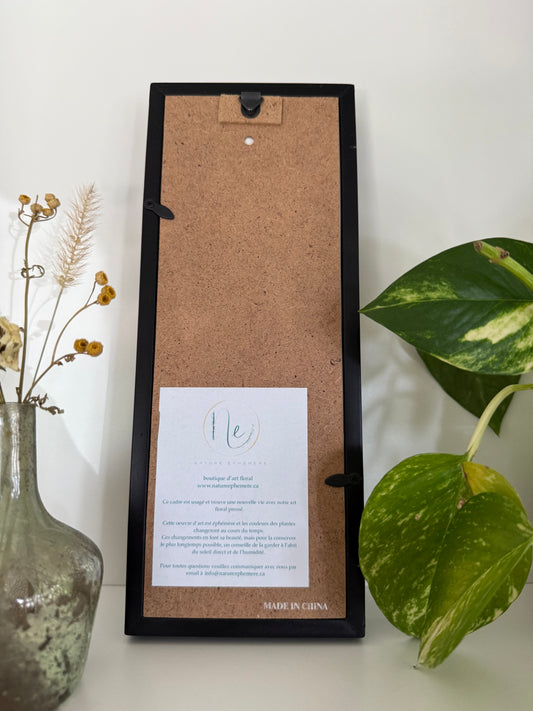 Nos œuvres encadrées en fleurs pressées sont créés ici au Québec, Canada. Chaque pièce est unique et met en valeur des fleurs que nous avons soigneusement cueillies dans nos jardins, dans la nature et chez notre fleuriste partenaire.