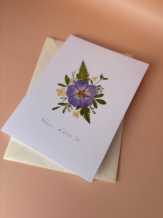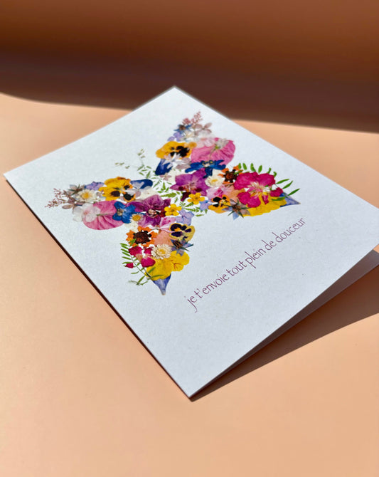 Chaque carte est l’impression d’une œuvre originale créée à partir de fleurs pressées, puis imprimée localement sur du papier recyclé à Montréal.