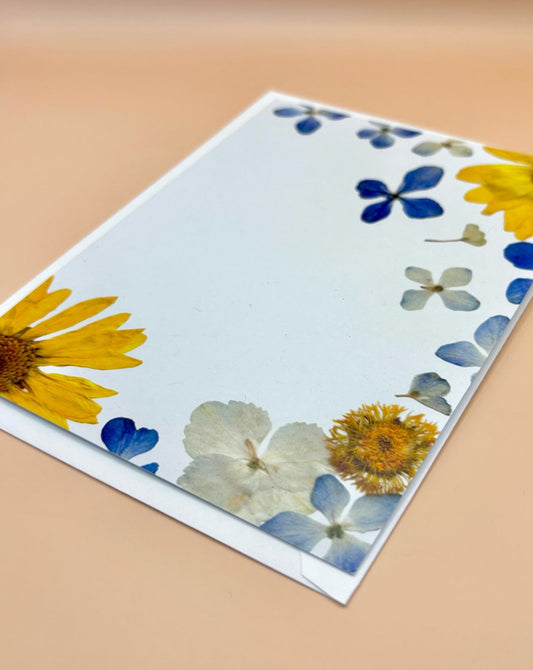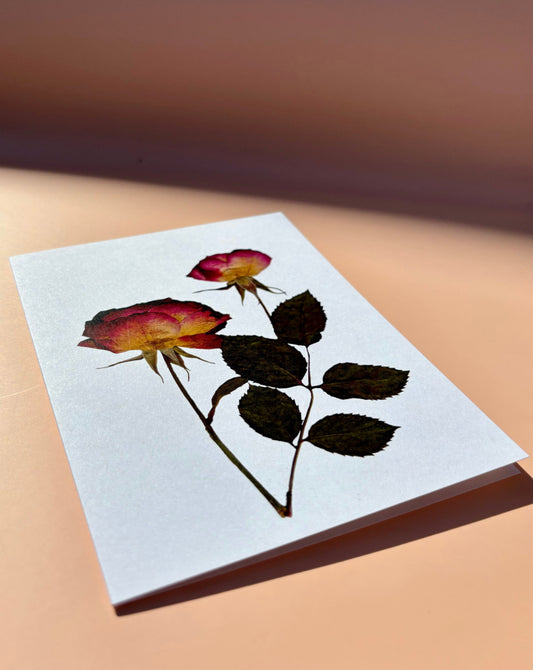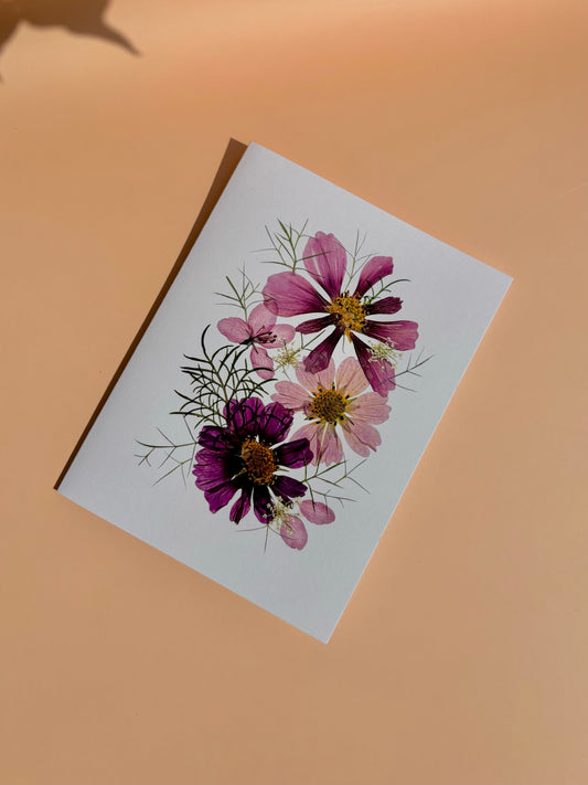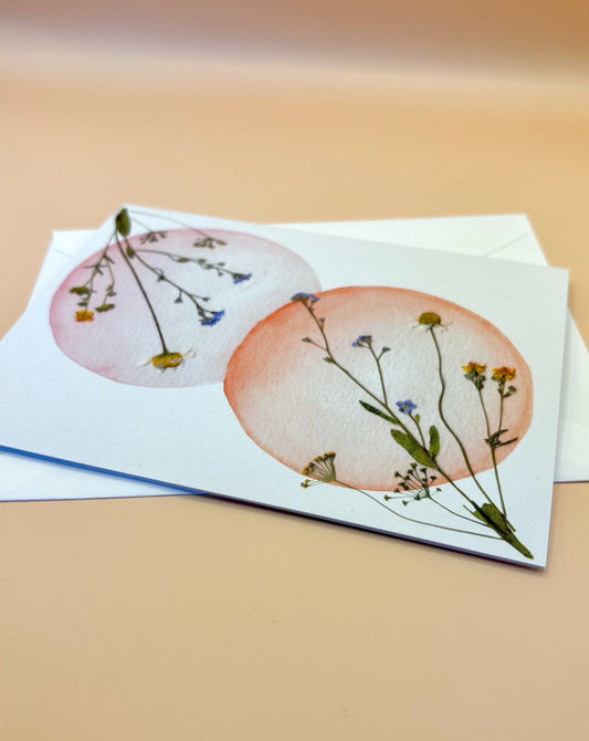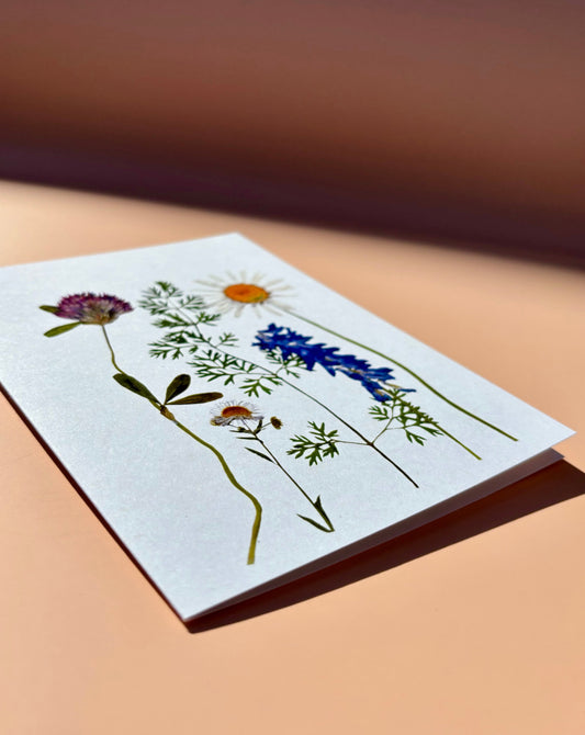 Laisse parler les fleurs. Nos cartes sans texte s’adaptent à toutes les occasions – un mot doux, un merci, une pensée spontanée. Chaque carte est l’impression d’une œuvre originale créée à partir de fleurs pressées, puis imprimée localement sur du papier recyclé à Montréal 🌱