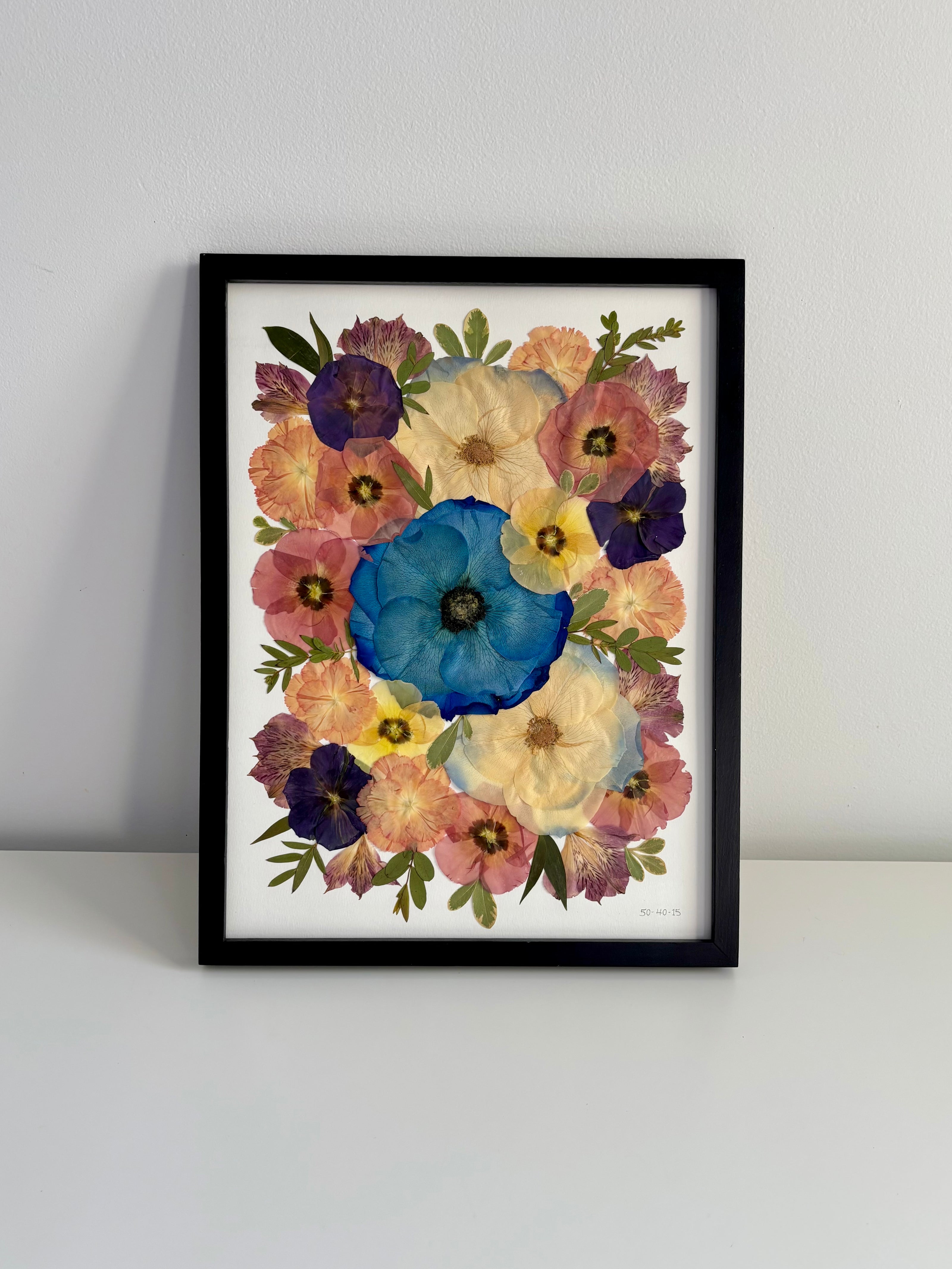 Chaque fleur est pressée à la main avec soin et préservée minutieusement afin de conserver ses couleurs aussi longtemps que possible. Cependant, il faut garder en tête que les fleurs évoluent naturellement au fil du temps, et que leurs couleurs vont s’adoucir ou changer. C’est ce qui rend chaque création unique : une beauté délicate qui continue d’évoluer et de se transformer à travers le temps.